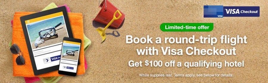 From now through November 23, 2014, when you book a round-trip flight through Orbitz using Visa Checkout as your payment method, you'll receive a promo code for a $100 discount on an Orbitz hotel stay completed between now and June 30, 2015.