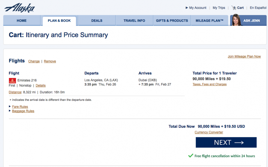 Alaska charges 90,000 miles each way from North America to the Middle East on Emirates, and there's actually a decent amount of availability, including this flight from Los Angeles to Dubai in February.