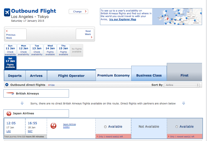 TPG recently booked his own first class award in JAL's first class using American miles. It cost him just 62,500 miles one-way. If you're booking a round-trip award, try BritishAirways.com or Qantas.com.au to search for award availability, as shown below.