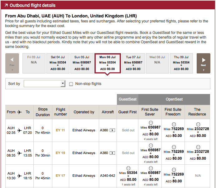 As you can see from these example awards below, it'll cost you about 2.33 million Etihad miles to book the Residence just one-way from Abu Dhabi to London. A First Suite Saver award is about 657,000 miles, while a regular first class seat aboard one of the airline's A340's is just 55,354 miles each way. So it costs you 42 times as many miles to book a Residence!