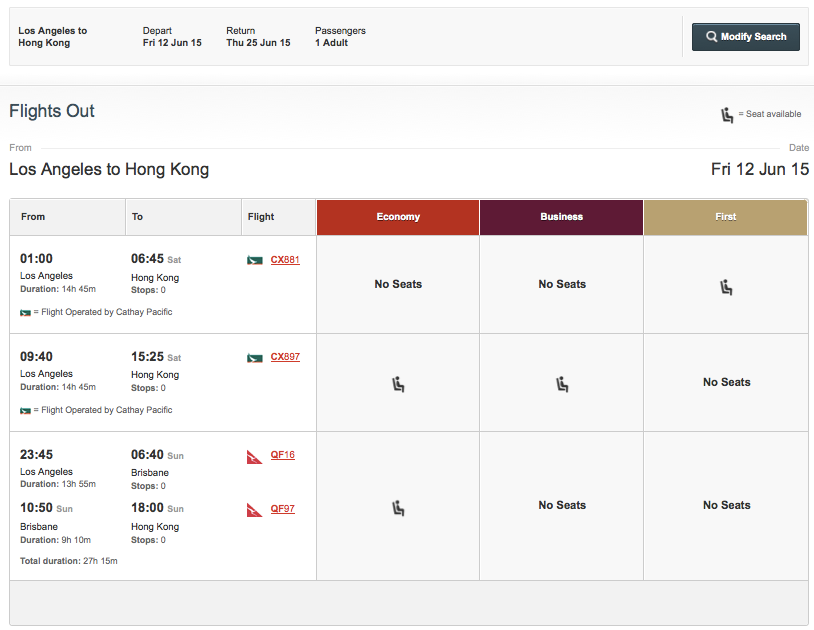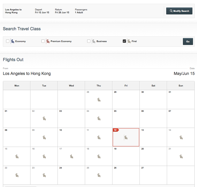 This Hong Kong-based Oneworld carrier has one of the best first class cabins in the world. The flagship is aboard its 777-300ER aircraft, and award space is actually pretty decent if you're flying to/from LA or San Francisco. Your best bet to nail it down is by searching Qantas.com.au, since you can find awards by class and by month using its flexible dates calendar: