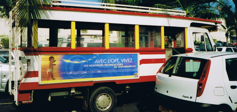 Riding in one of Tahiti's famous "Le Truck" buses was our most interesting airport transfer to date! Image courtesy of Wikimedia Commons.