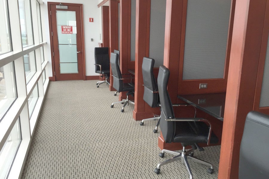 There was, however, one bright point to this lounge. To the left of the bar, down a narrow and long corridor, past the bathrooms, there were a few carrels that were fantastic for getting work done. There's nothing else down the hall, and it was tucked away in the corner behind the bathrooms, so despite the rest of the lounge being fairly busy, there wasn't a single other soul here. Unlike the standard work carrels that are tucked away in a dark room, there was plenty of natural light and a good view of the US Airways gates. Pretty fantastic, and a hidden treasure in an otherwise dismal lounge.