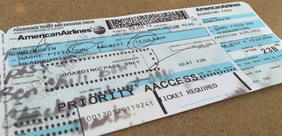 Interestingly, the boarding pass showed me "booked" on flight AA 9137, from Sabre Field SVC to Headquarters — Sabre is the name of the American Airlines reservation system. Unfortunately, they stuck me in a "middle seat" — but at least they gave me Priority AAccess!