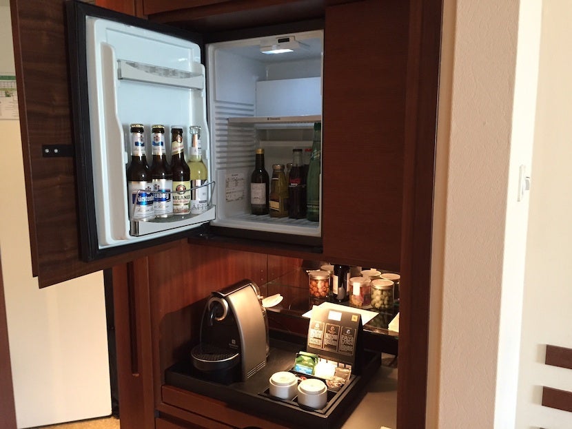 The room also held a big work desk with an ergonomic chair, a chest of drawers, a TV, a pretty sizable closet and a mini-bar. Most exciting to me was the little Nespresso machine with capsules, sugar and milk I could use the next morning to brew a quick cuppa before I departed.