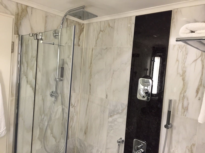 The bathroom had marble walls and a black stone counter with a single sink. Spacious by European standards, but spare.