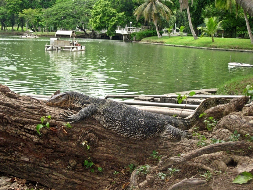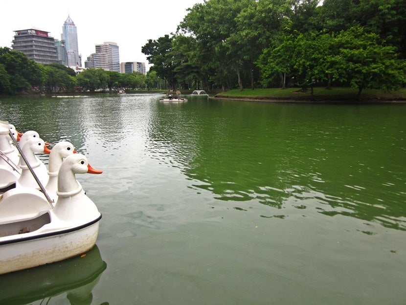 You'll also find a lake where you can rent small paddle boats for 30 THB (just under $1) per hour. I highly recommend a paddle around the lake for great views of the park that is rimmed by the Bangkok skyline. Look out for the giant monitor lizards that swim or lazily lounge near the water's edge. These huge reptiles aren't particularly aggressive, but you should still avoid getting too close. Also keep an eye out for fish, beetles and giant turtles.