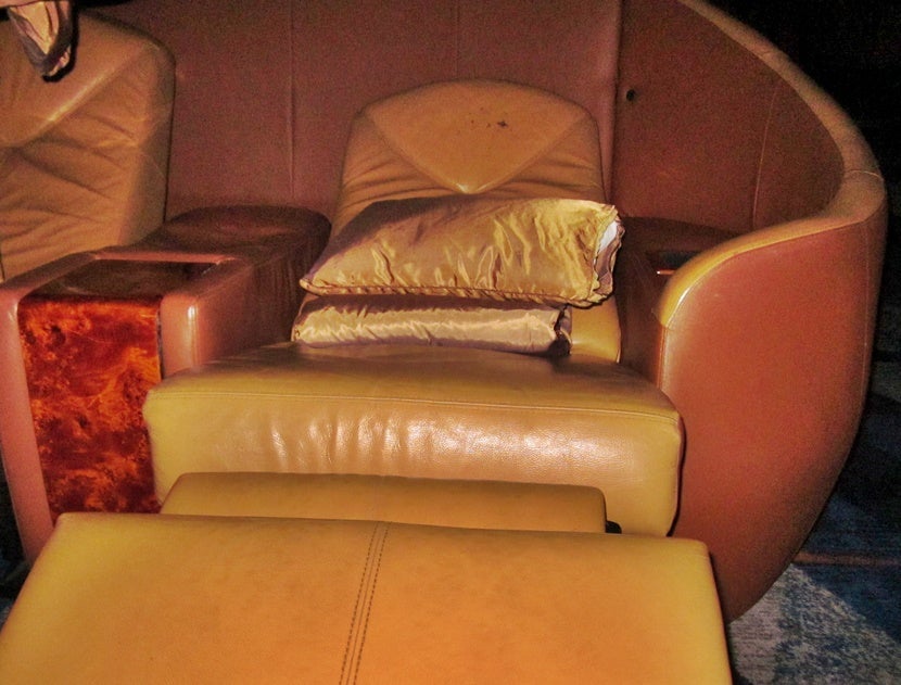 Anyone who loves the seats in the pointy end of the plane will love this theater's wide, cushy leather seats, each of which is trimmed in lacquered wood and comes with a pillow and blanket. Be sure to use that blanket, by the way, and bring a jacket or scarf, as well — the AC here can be really cold.