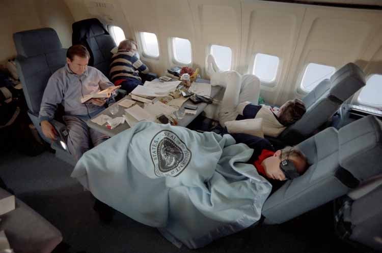 The President had a sofa to rest on, but other passengers had to make do with these cloth recliners. It's a far cry from flying first class on Cathay Pacific.