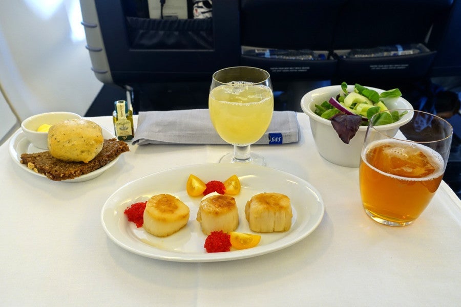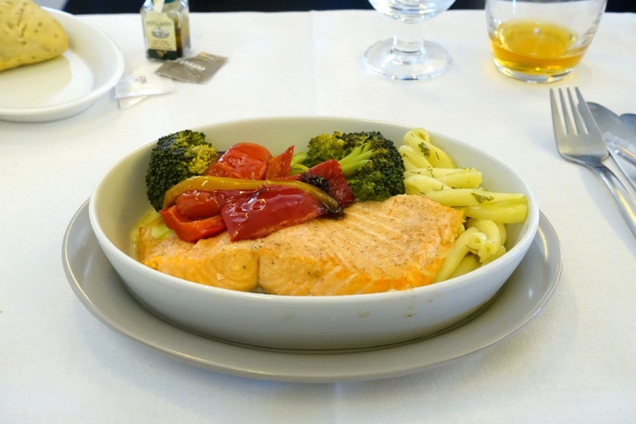 8. The food is very good — I wish this weren't unusual for transatlantic flights, but many of the airlines flying to Europe aren't known for their catering (with some notable exceptions). I had scallops with caviar to start, followed by a moist and flavorful trout dish with broccolini and pasta, and a delicious cherry tart and a small container of chocolate ice cream for desert. Then, the crew served a second meal of roast beef before landing.