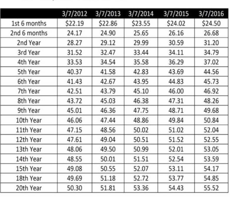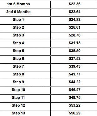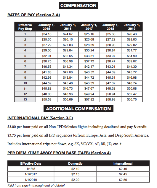 Southwest's current pay scale, with each step representing the rate per TFP.