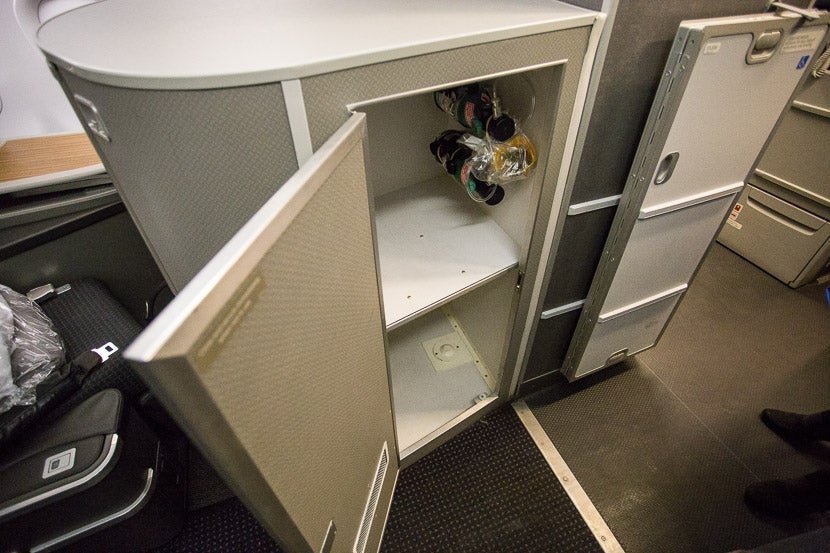 Each business-class seat has its own 15.4-inch fixed-screen personal entertainment system that can be used for the entire flight, including during take-off and touchdown. There isn't quite as much at-seat space to store personal belongings as you'll find around the first-class seat, but there's an area designed to hold your smartphone and a small shelf under the entertainment screen where you can keep something small like a book or digital tablet.