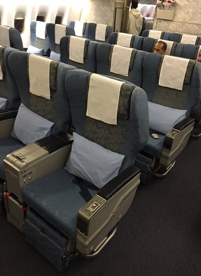 The business class of the 777 aircraft is in a 2-3-2 formation with chunky old seats — kind of like those seen in Home Alone. The first-class cabin is arranged in four rows of 2-2-2, with the same design pattern, which ended up reminding me of the seats when I flew Air Seychelles from Charles de Gaulle to Seychelles in 2010.