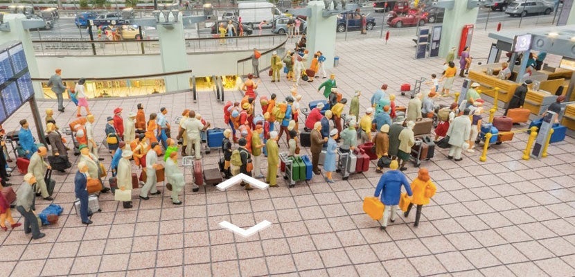 You can click through to board a Thai Airways Airbus A380 flight, fly through arrivals and pick-up, explore the Lufthansa hangar, wait in line for check-in — cooler than it sounds thanks to all the tiny models — watch the airplanes take off and head out onto the airstrip.