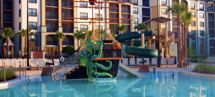 This Orlando area resort has complimentary pool cabanas, water cannons, water slides, an interactive pirate ship pool, zero-entry shallow pool area, and tons more for kids and families.