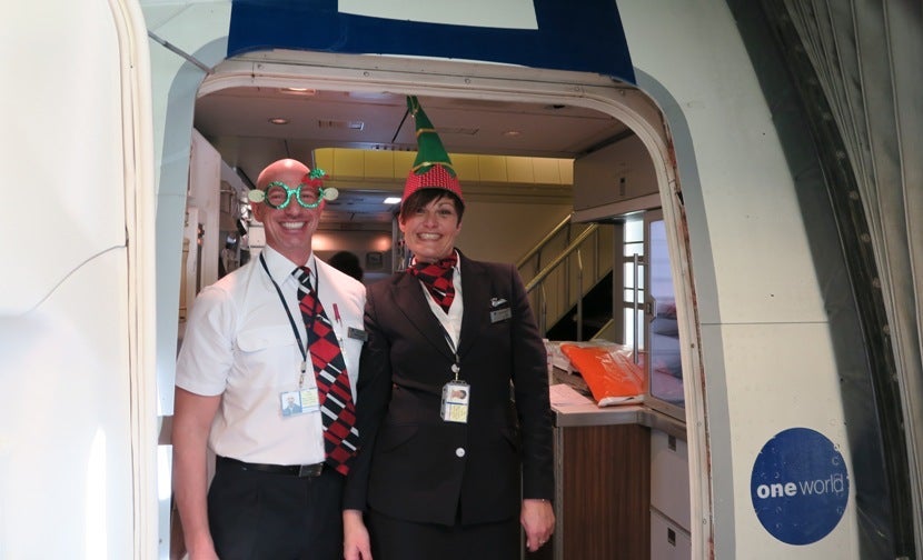 Documents confirmed, we boarded the plane and were greeted at the door by flight attendants sporting silly holiday hats and glasses — we were flying on Christmas Eve and the crew had decided to make it cheerful. Once on board, we turned and walked up the flight of stairs I've always wanted to, up to the glorious upper deck of the Queen of the Skies!