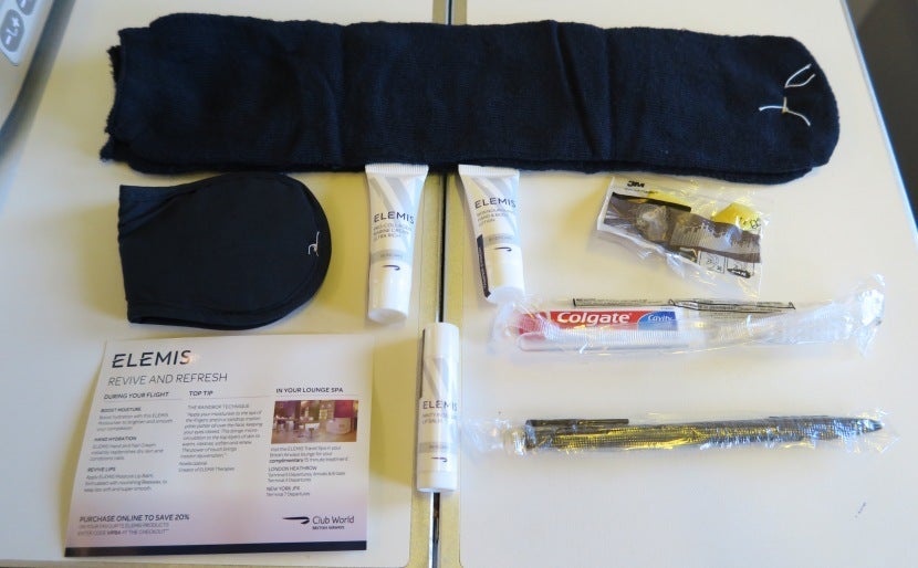 Flight attendants passed through the cabin soon after we boarded to hand out Elemis Club World amenity kits. The drawstring bag contained socks, an eye mask, hand and body lotion, "pro-collagen marine cream ultra rich" lotion, minty lip balm (which was greatly appreciated during this flight), simple earplugs, toothbrush, toothpaste and a pen.