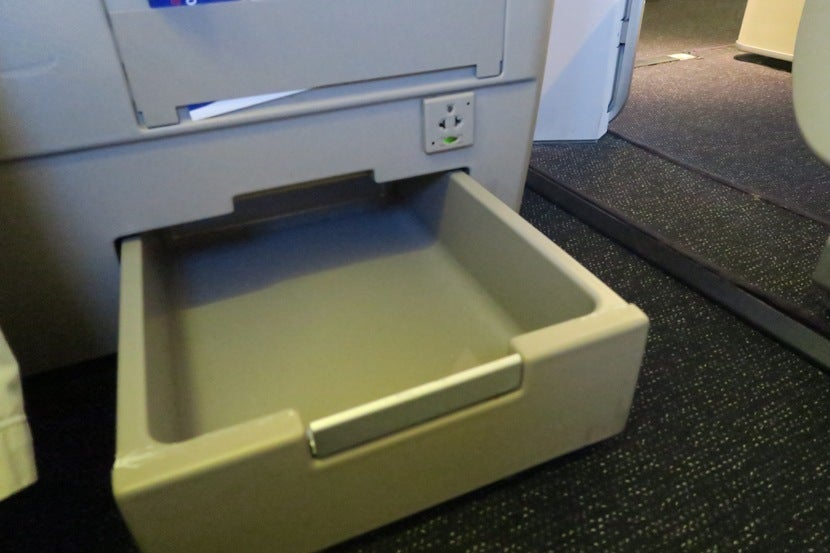 If you need additional storage, there's also a storage tray at your feet, which slides out from its resting place underneath your neighbor's seat. An outlet was located directly above the bin, so I used this bin to store my laptop and phone while they were charging. No charging was allowed during taxi, takeoff and landing.