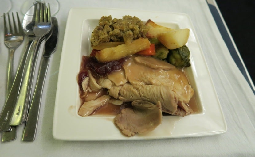 As I was tickled by the thoughtfulness of British Airways specially sourcing a Christmas dinner for tonight's flight, I certainly had to order the meal. I found the turkey to be quite moist, tasting freshly sliced and not at all reheated. Likewise, the stuffing was perfectly prepared, however the potatoes suffered the opposite fate. The brussel sprouts and yam slices were flavorful sides.