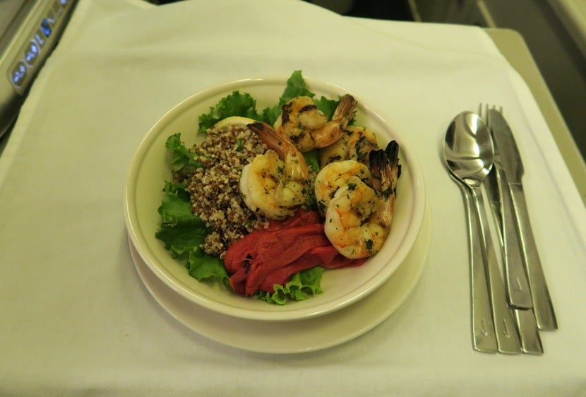 Katie ordered the "Chilled main course zesty quinoa salad with coriander and lime king prawns." She found the shrimp well prepared, although the accompanying quinoa was a bit undercooked.