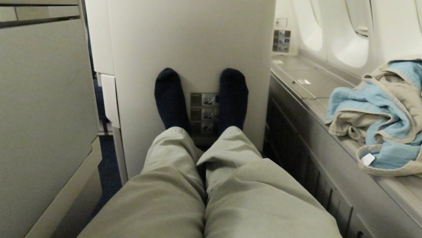 The standard (non-exit row) Club World seats are listed at 72-inch pitch, so they're sized fit to someone no taller than me at 5 foot, 11 inches. When I lay flat on Katie's seat (61A), I touched the seat shell at my head and my feet — if you're as tall as The Points Guy (at 6 foot, 7 inches), you're going to want to grab an extra legroom seat like 62A/K or 64 A/K.