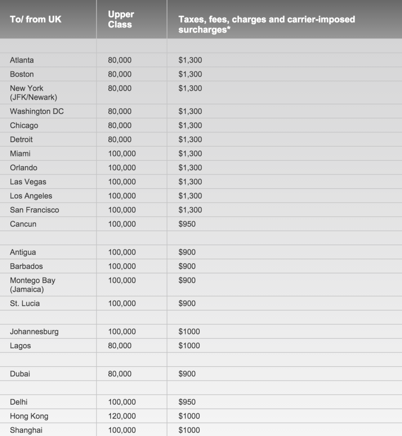 Here's Virgin's Upper Class award chart for round-trip flights to/from the UK:
