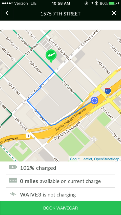 Returning the car was also an easy experience. While I brought my car back to the WaiveCar garage, you can also return it to any public electric charging station in Santa Monica, a three-hour meter or any legal public parking spot within the Santa Monica City limits — parking meters are free since WaiveCar has special permits from the city. More info can be found on its FAQ page. One important detail: WaiveCar says if you leave your car at a three-hour meter or legal parking spot, the vehicle (battery) must be charged at least 25%.