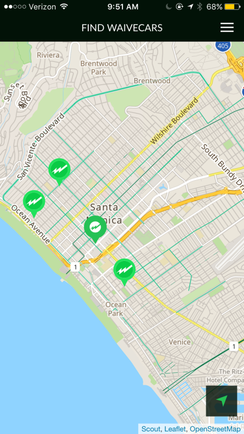 The reasoning for this is that Isaac doesn't want you to hold onto the cars all day — he wants to keep them moving around town, not just sitting at the central WaiveCar garage. When you reach your destination, park your WaiveCar at a Santa Monica city parking meter for free with the city-issued stickers, end your WaiveCar ride and potentially let someone else use it. When you're ready for another ride, fire up the app and see where your next car might be located.