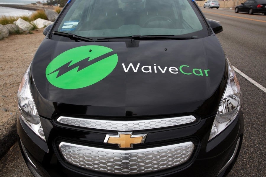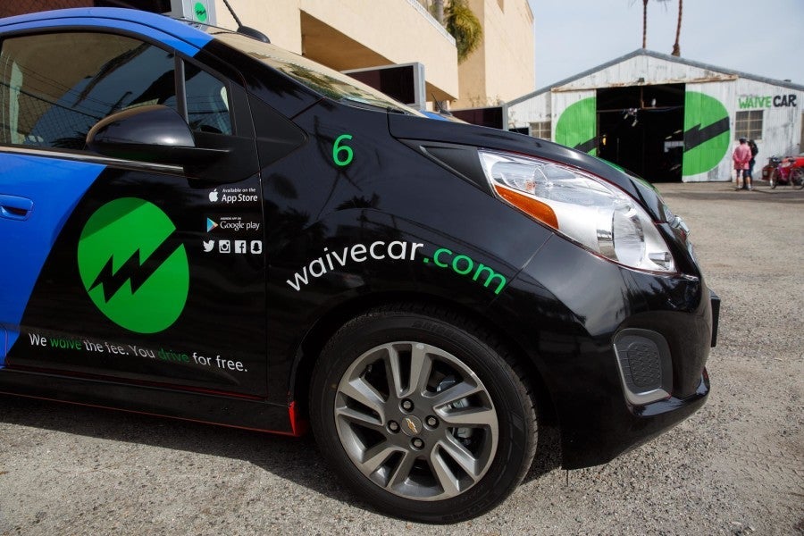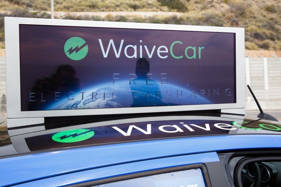 Enter WaiveCar, a new service in Santa Monica, California, with the slogan "We waive the fee. You drive for free." The first two hours of the rental are free — insurance included — and after that they charge only $5.99 per hour. Unlike other services like ZipCar, which start at about $10 per hour, there are no application or membership fees. Instead, WaiveCar is supported by advertising — there's an ad wrap on the back of the car and a roof-mounted LCD board like those commonly found on Taxis in NYC, so you're essentially driving a mobile billboard.