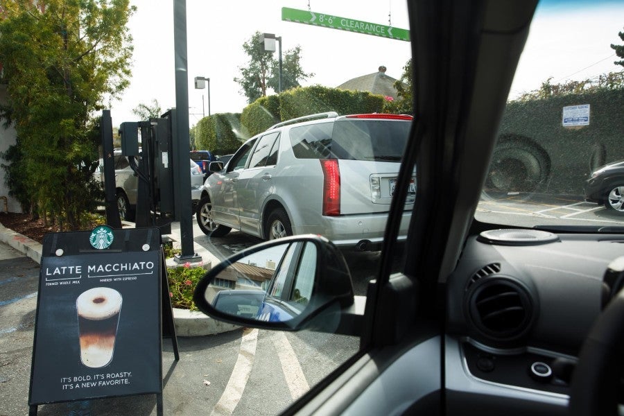 We first made a stop for some caffeine at Starbucks — I was curious if there would be issues with the roof-mounted advertising display board, but it passed without any problems. Doing my best to drain the battery, I put the car in "sport mode," turned on the air conditioning, radio, heated seats and plugged a phone charger into one of the multiple DC power outlets.