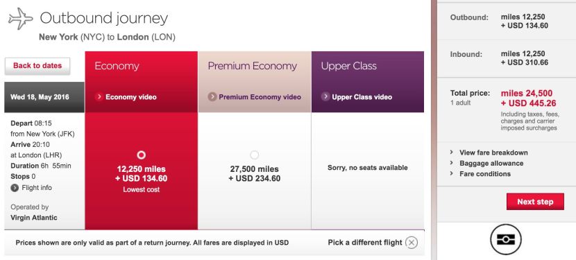 For a round-trip flight between JFK and LHR in May, you can book an award ticket at the discounted rate for 24,500 Flying Club miles and $445. If you were to pay cash for the same ticket, it would cost you a total of $1,701. Based on TPG's most recent valuations, which peg Virgin Atlantic Flying Club points at 1.5 cents apiece, the round-trip award ticket would cost around $368. When adding the additional fees, the total for the ticket comes to around $813 — in this case, the discounted award ticket would save you around $888.