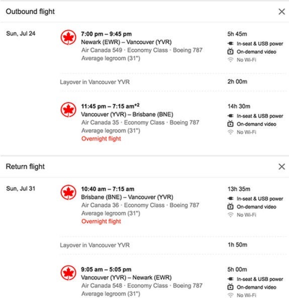- Air Canada: 36 Brisbane (BNE) 10:40am Departure ⇒ Vancouver (YVR) 7:15am Arrival