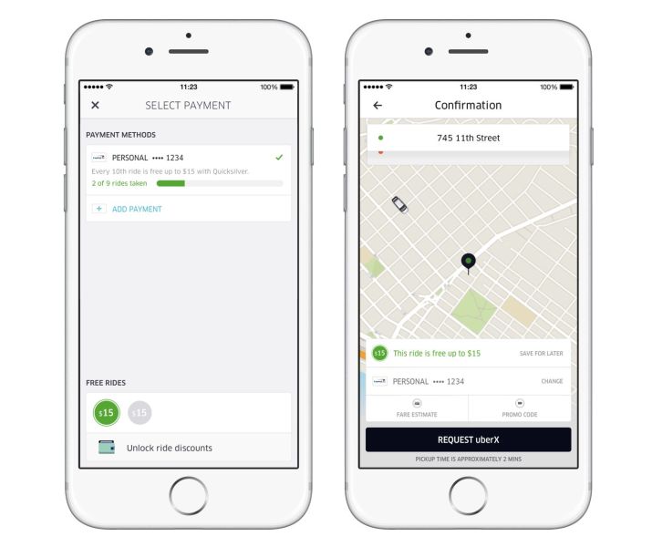 Once a passenger has used one of their eligible cards to ride nine times with Uber, the free 10th ride will automatically be credited to their account, and the free rides will be available to use through April 30, 2017 — a month between when the promotion ends and when the free rides will expire. This is an especially nice perk in that the rider can choose when to use the free ride — it doesn't have to be the first ride after they've hit the mark. It's worth noting that you cannot stack multiple $15 free rides during one ride — each must be used on its own. Note that this is available for all passenger services, such as UberX, UberPool and UberBlack rides, but it does not include other services like UberTaxi, UberEats or UberRush. In addition, you must use a Quicksilver card to pay for each ride, and other services like PayPal or Apple Wallet are not eligible.