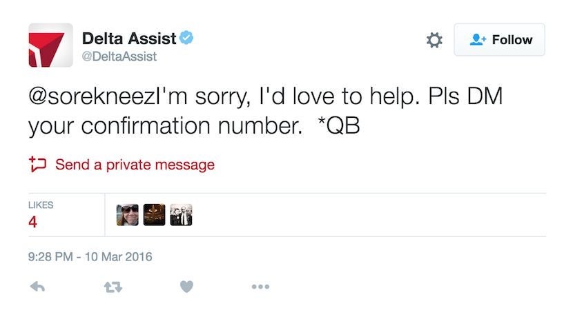 Should you ever need to tweet an airline about a problem, you'll save a lot of time if you're already following that airline on Twitter. That way, the airline will be able to direct message (DM) you immediately with a response, rather than wasting time tweeting you to follow them so you can continue your conversation privately — which you'll have to do should the airline ask you to relay private information like your reservation confirmation number. If you're trying to get help with a missed flight, that saved time could be very valuable.