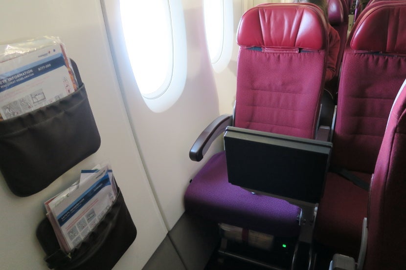 The Malaysia Airlines A380-800 economy cabin made a good first impression with clean, new-looking seats. I'd hoped to select an upper deck window economy seat at check-in, as these seats are a 2-4-2 configuration and the window seats have special seat-side compartments for storage. However, when I chose my seat at check-in, no upper deck window seats were available.