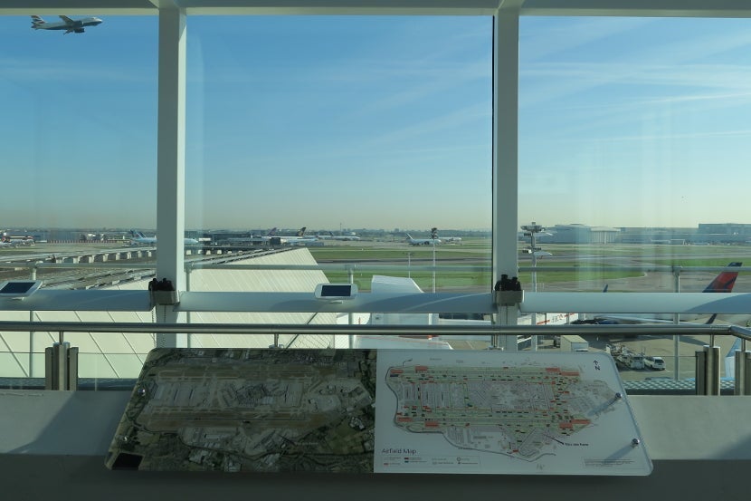 I found a free viewing deck near Terminal 4 gates 15 and 16 that offered elevated views of one of the LHR runways as well as binoculars and tablets showing aircraft in the surrounding airspace. After enjoying the view — and spotting the retired British Airways Concorde — I made my way to the lounge.