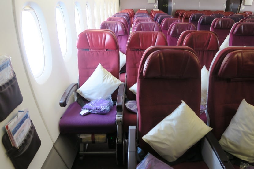 The lower deck economy cabin is arranged in a 3-4-3 configuration. I chose seat 74K, a special seat because there is no other seat directly in front of it. I purposefully chose this seat to allow for easy aisle access and plenty of legroom while still having a window.