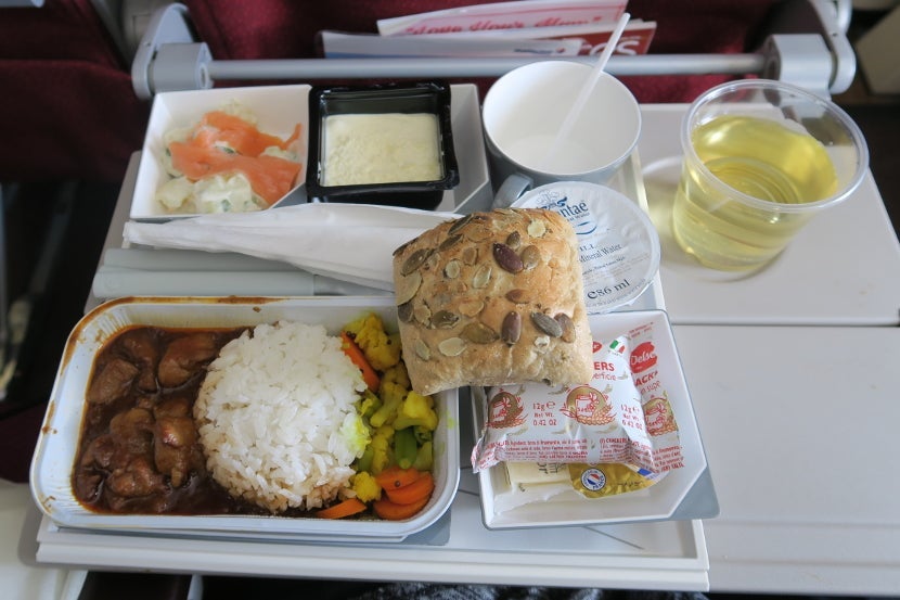 Breakfast — a choice of coconut rice with spicy seafood or eggs — was served exactly three hours before landing. I opted for the eggs and found that this dish contained much more than just eggs! There were also well-seasoned grilled tomatoes and peppers, a soggy hash brown filled with a mushroom mixture and an impressive so-called "egg roll" — a thin strip of scrambled eggs rolled with a layer of a creamy potato sauce and small flecks of ground beef.