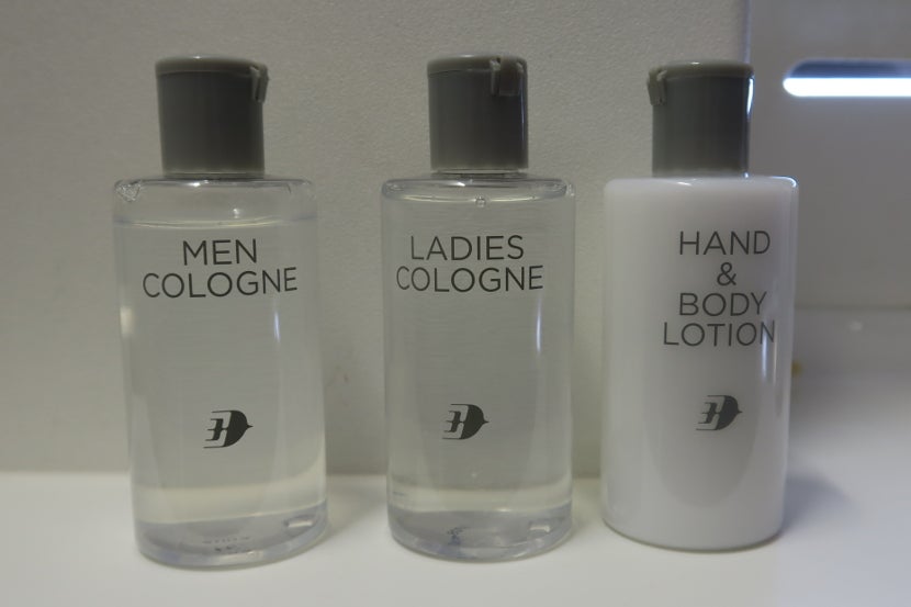 In the bathrooms, lotion, men's cologne and women's cologne were freely available. Strangely, these bottles disappeared from all three bathrooms I checked about two hours before landing — right when most people probably needed them!