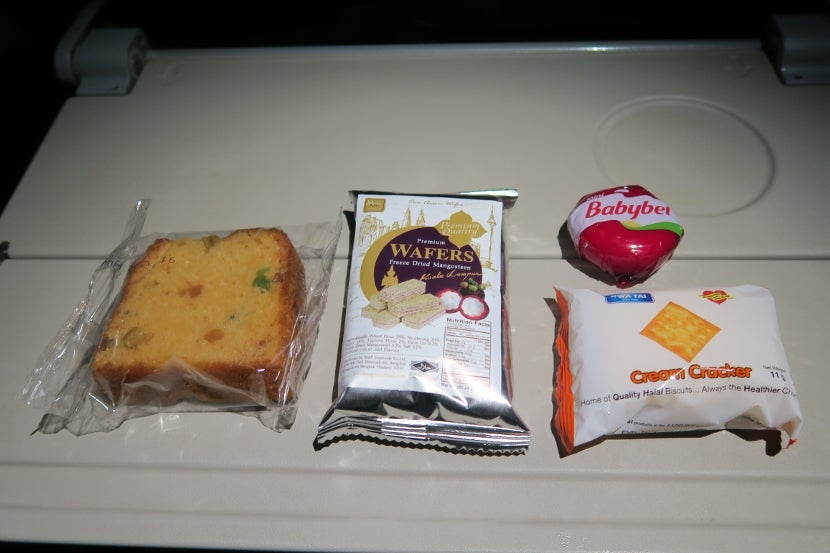 When I awoke with six hours and 10 mins remaining in the 12-hour-and-13 minute-flight — after sleeping soundly for about two hours — I found a snack box waiting for me on a folded-down half-tray. It contained four different snack items: sweet strawberry wafers, saltine crackers, a citrus-flavored breakfast bread and a piece of soft cheese wrapped in wax, enough to satisfy any hunger or cravings.