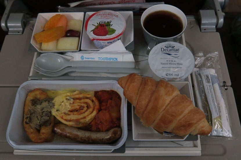 Both breakfast options were served with a fruit salad composed of fresh-cut melon, orange slices and grapes, a small cup of strawberry yogurt, a cold but fluffy croissant with jam and butter, a small cup of water and your choice of hot beverage or juice.