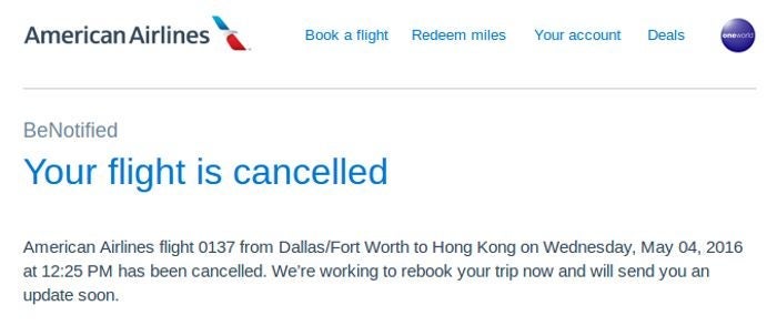 American Airlines emailed me that my DFW to HKG flight had been canceled.