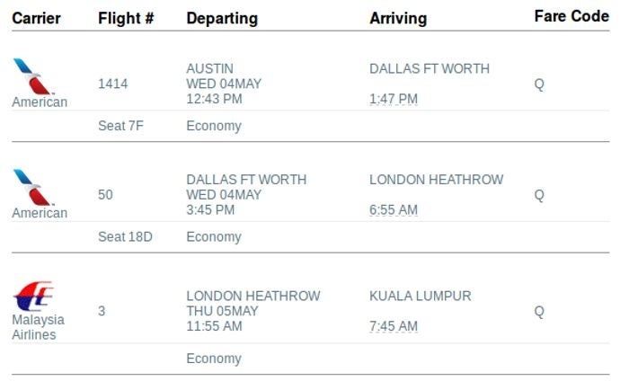 The next-best option would be to fly directly from AUS to London (LHR) to KUL, but it seems AA didn't want to pay British Airways for the AUS-LHR leg — as it refused this request. Instead, it offered AUS-DFW-LHR-KUL, with the transatlantic flight on the American Airlines 777-300ER. Since the rebooking process had already spanned almost three hours, I accepted this option.