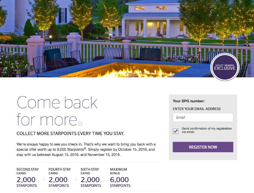 Here's how it works. Go to SPG's promotion page and enter your SPG number. From there, SPG will determine if you're eligible or not. If you are, you must register by October 15, 2016 and stay at eligible SPG properties between August 15 and November 15, 2016 to earn up to 6,000 bonus Starpoints.