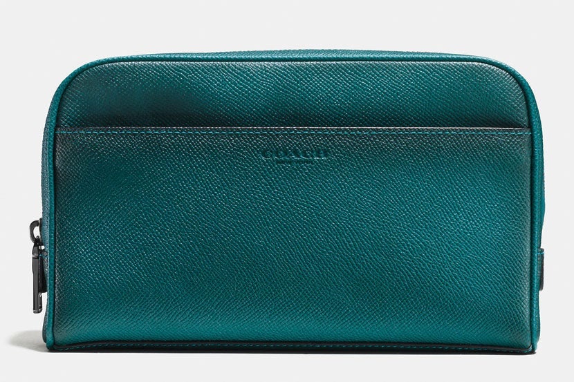 For a fancier dopp kit, the Coach Men's Travel Kit is a fashionable and modern choice. The burnished crossgrain leather offers a distinctive texture and durable finish, while the body itself is lined with refined twill. There's a multifunction pocket inside as well. ($165, measurements are 5.25"H x 8.5"W, coach.com).