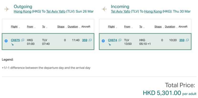 • CX674 Tel Aviv (TLV) 1:50pm Departure ⇒ Hong Kong (HKG) 5:10am (+1) Arrival