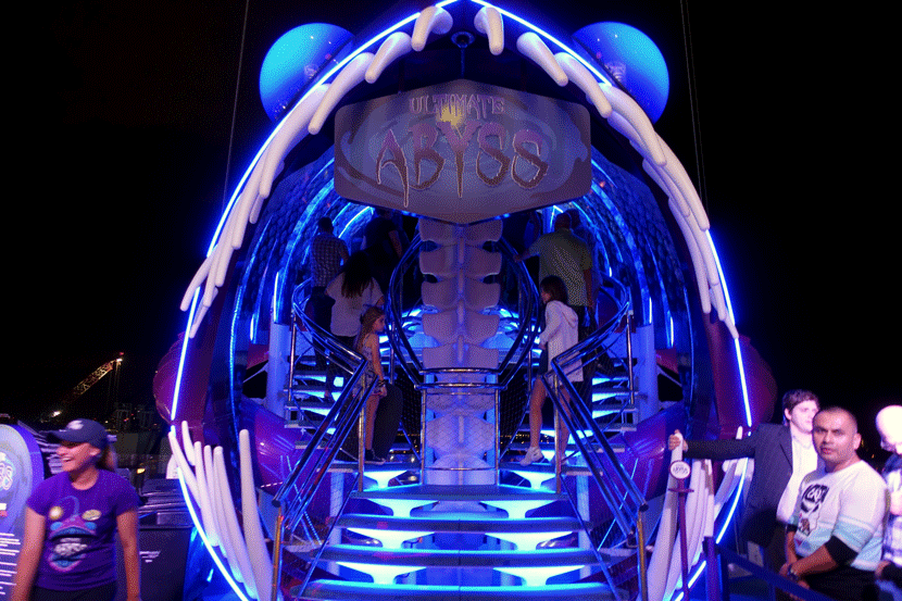 Here's what the entrance to the slide looks like at night when it's all lit up to resemble a scary, monster-like fish.