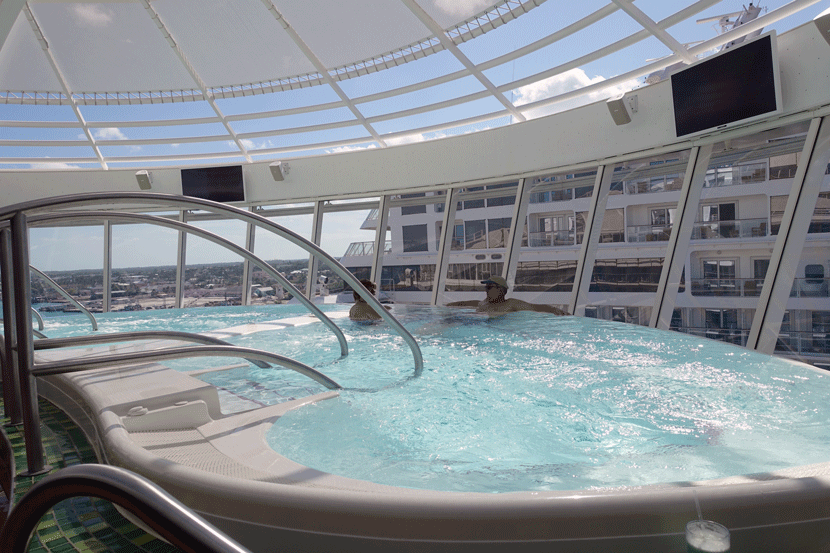 It's hard to tell from this photo since we were docked in Nassau at the time, but there are several whirlpools that actually hang out over the edge of the ship — this was the only photo I could get without a pool full of people though.