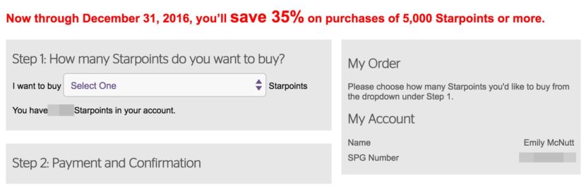 Now through the end of the year, you can buy Starpoints at a discount of up to 50% off. Note that this promotion through Starwood Preferred Guest is a targeted offer, so the discount you'll get will vary. Three TPG team members were targeted with a 35% discount; one got a 30% offer; and others got the full 50% discount. To check what you're eligible for, go to SPG's Points.com page and log in.