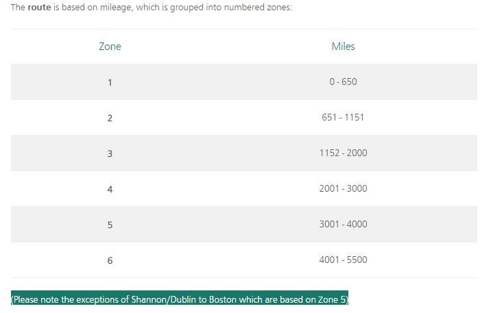 This British Airways Avios repricing comes as Aer Lingus is launching its new AerClub Avios program, the AerClub. The mileage bands are identical to British Airways, though there's a small, but important note at the bottom of the chart: "Please note the exceptions of Shannon/Dublin to Boston which are based on Zone 5".